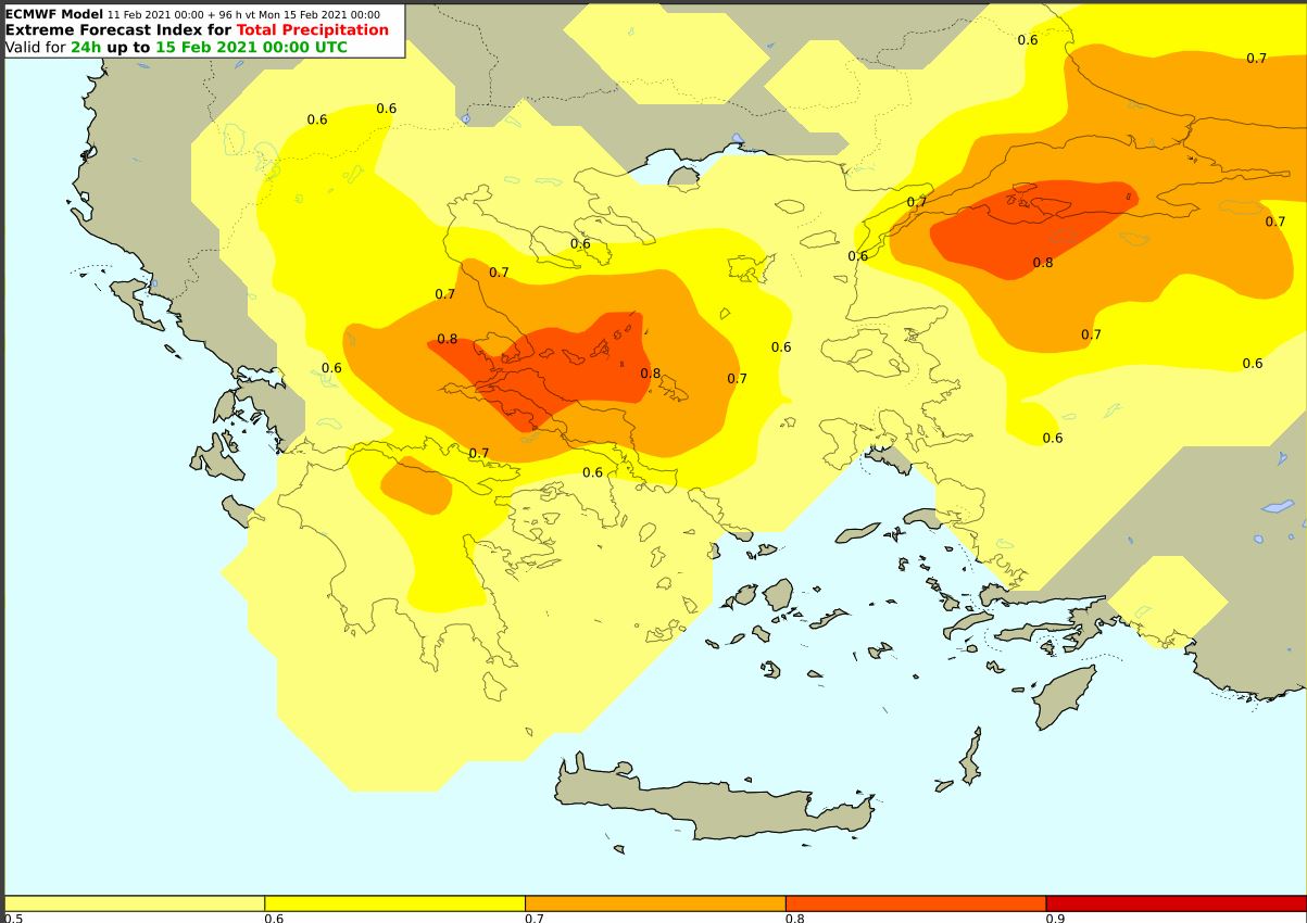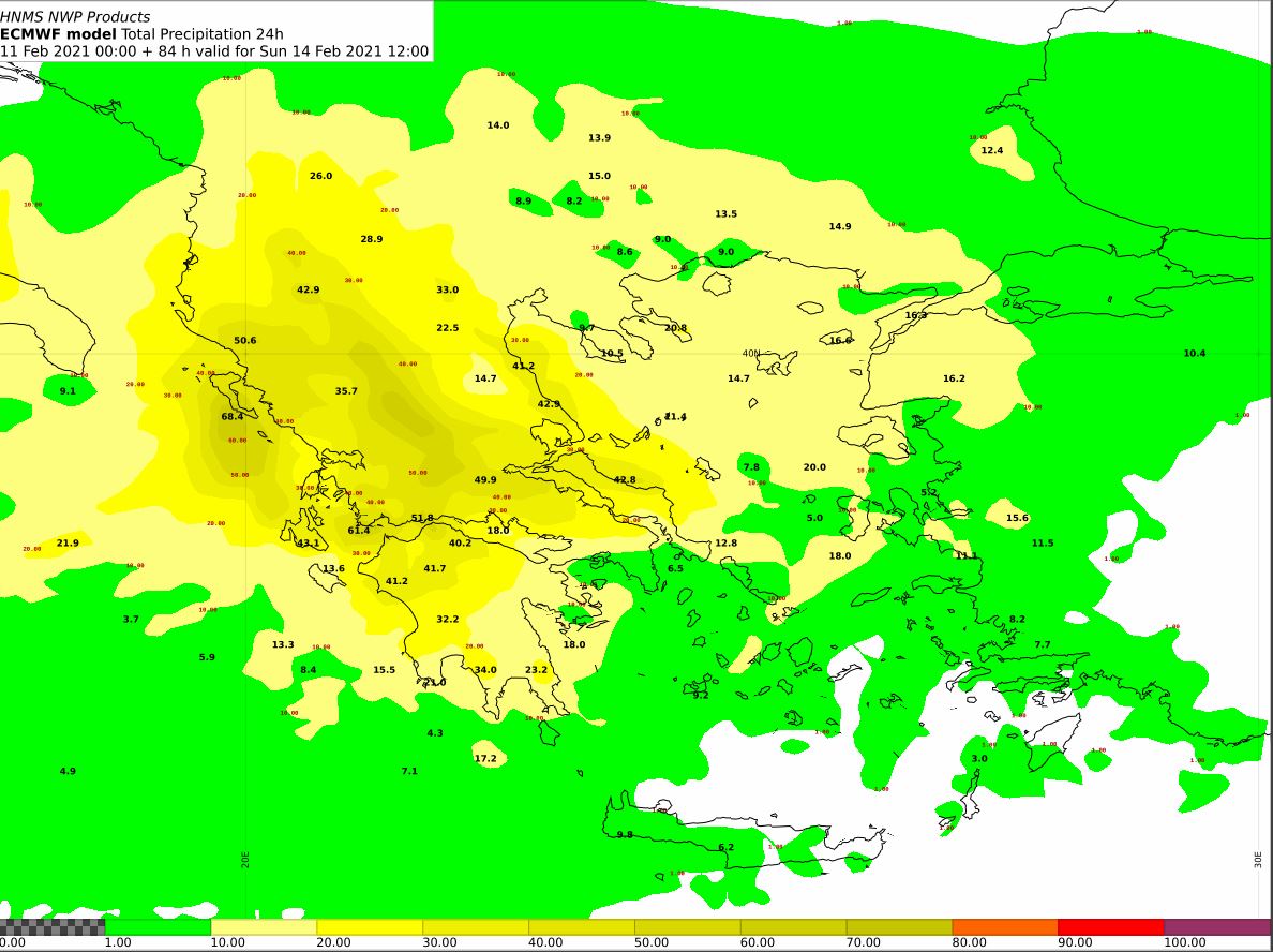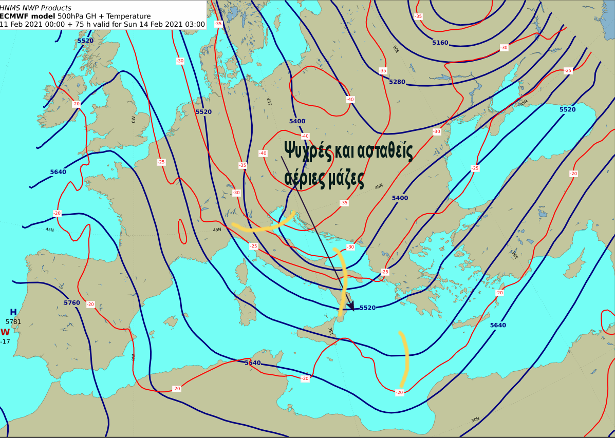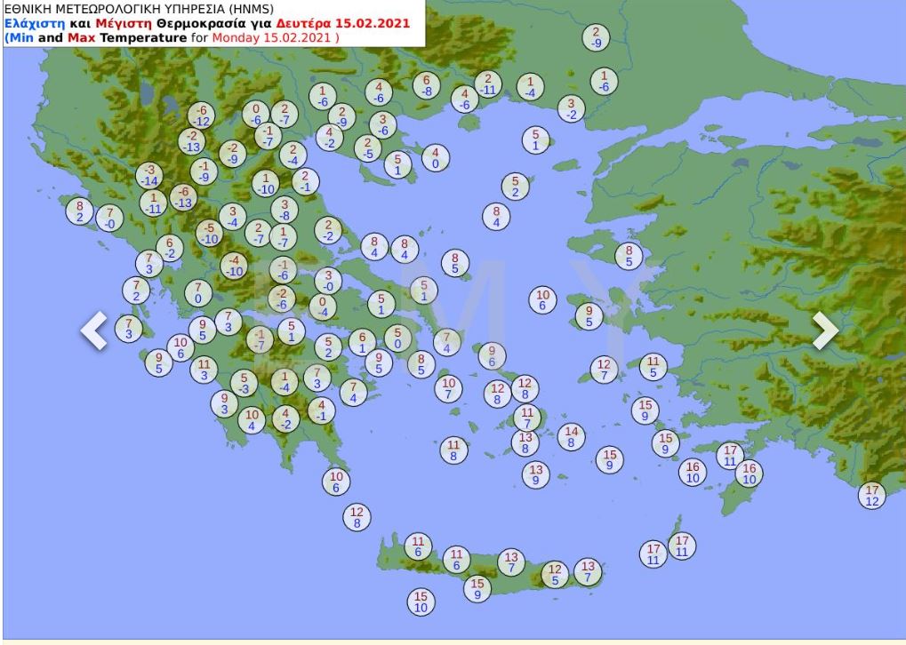 Κακοκαιρία προβλέπεται από το μεσημέρι του Σαββάτου από τα δυτικά και τα βόρεια, που βαθμιαία την Κυριακή (14-02-2021) θα επικρατήσει και στην υπόλοιπη χώρα, με κύρια χαρακτηριστικά τις κατά τόπους πυκνές χιονοπτώσεις, τη μεγάλη πτώση της θερμοκρασίας από βορρά προς νότο σταδιακά, της τάξης των 14-18 βαθμών Κελσίου και τον ισχυρό παγετό. Στα πελάγη θα επικρατήσουν πολύ θυελλώδεις βόρειοι άνεμοι , τοπικά σε επίπεδο θύελλας στο Αιγαίο και θα εκδηλωθούν ισχυρές βροχές και καταιγίδες