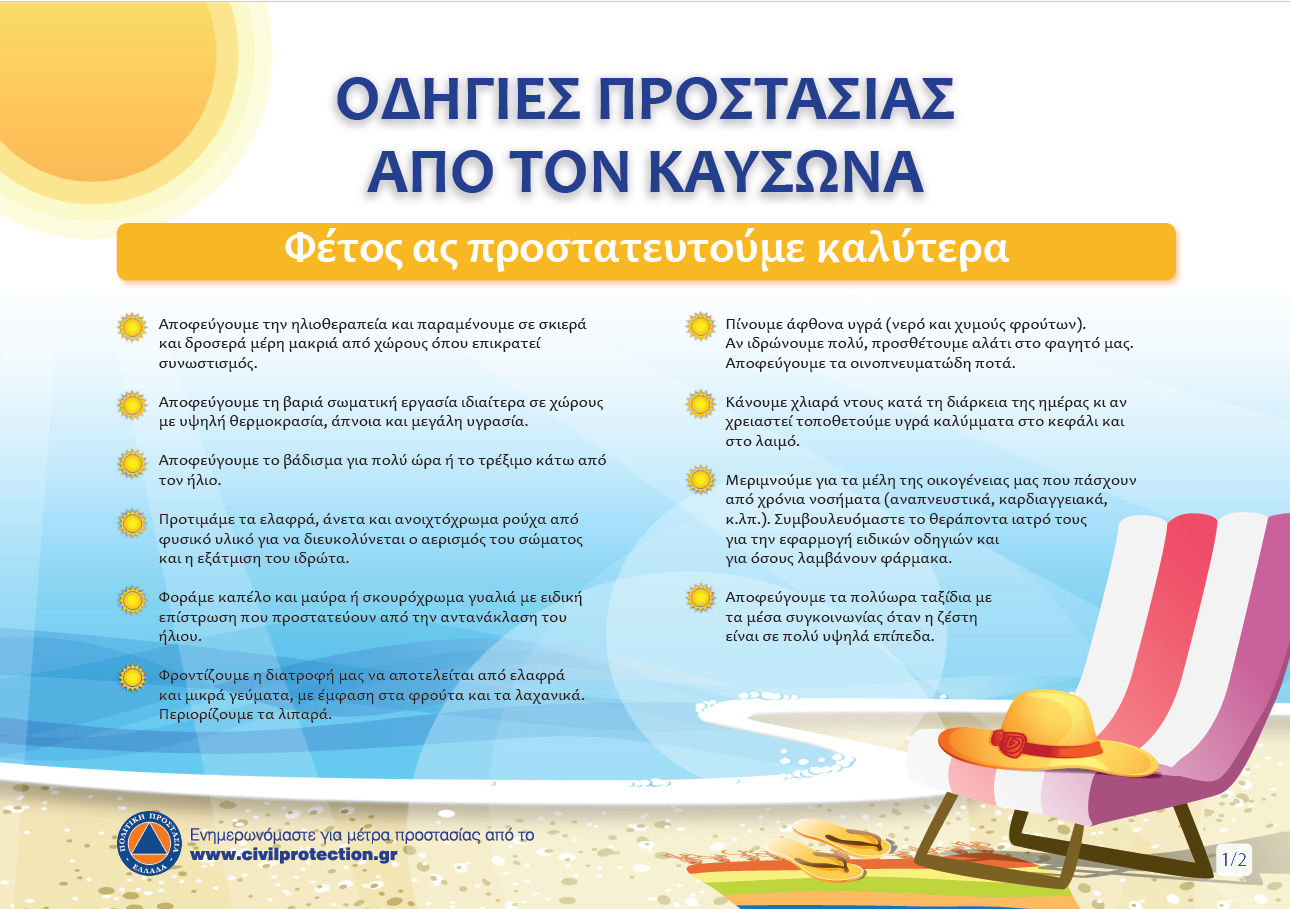 Σας συστήνουμε να λαμβάνετε υπόψη σας τις οδηγίες της ΓΓΠΠ σχετικά με τις υψηλές θερμοκρασίες σε περιόδους καύσωνα . Σε κάθε περίπτωση θα πρέπει να γνωρίζετε ότι η ΕΜΥ λαμβάνει υπόψη της όλα τα διαθέσιμα προγνωστικά στοιχεία και μετά από σχετική αξιολόγησή τους, εκδίδει τα ειδικά δελτία πρόγνωσης και προειδοποιήσεων, καθώς και τη σχετική ανάλυση της προβλεπόμενης εξέλιξης του καιρού.