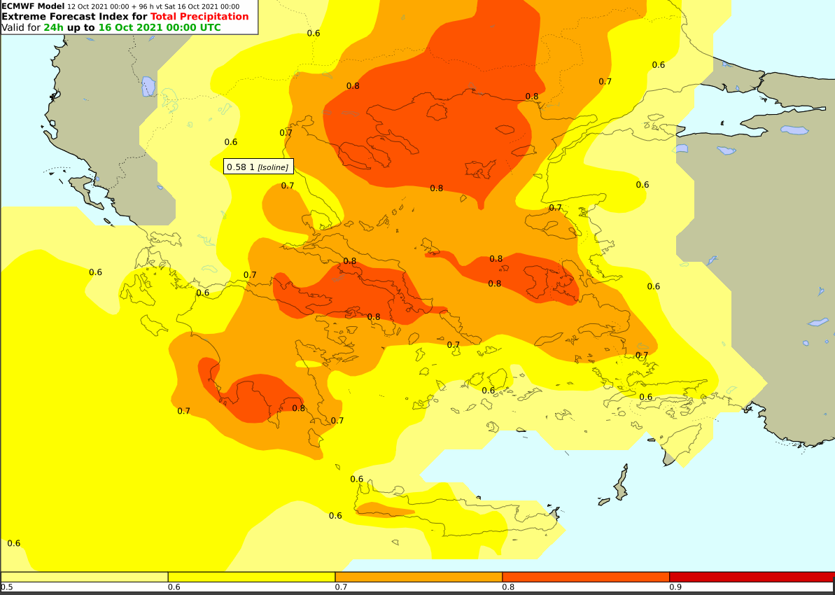 Στους χάρτες παρουσιάζονται τα ύψη βροχόπτωσης 24ωρου στον πρώτο χάρτη και στον δεύτερο υπάρχει η χρωματική απεικόνιση του δείκτη Extreme Forecast Index όπου αποτυπώνεται πολύ καθαρά η δυναμική του συστήματος κακοκαιρίας