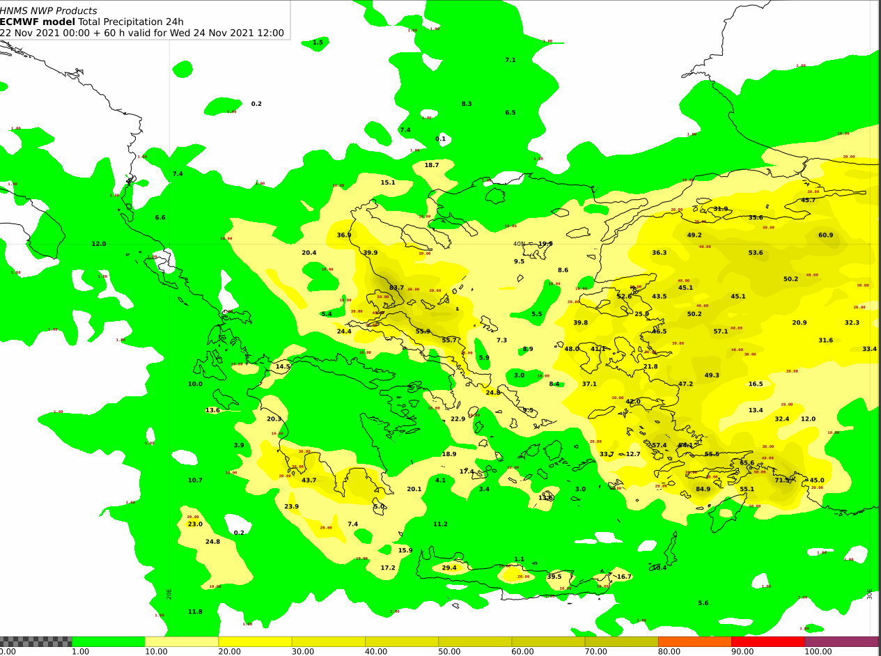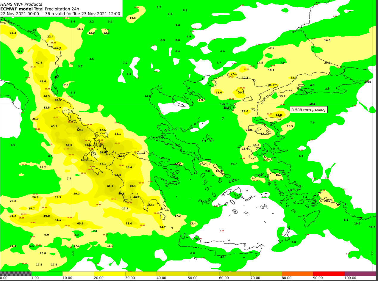 Την Τρίτη οι ισχυρές βροχές και καταιγίδες θα συνεχιστούν κατά διαστήματα στις προαναφερθείσες περιοχές και θα επεκταθούν, από τις πρώτες πρωινές ώρες στην ανατολική Μακεδονία, τη Θράκη, τα νησιά του βορείου και ανατολικού Αιγαίου και μετά το μεσημέρι στα Δωδεκάνησα. Από το απόγευμα πάντως τα ισχυρά φαινόμενα στα δυτικά θα εξασθενήσουν, αλλά θα επηρεάσουν πρόσκαιρα την ανατολική Θεσσαλία, τις Σποράδες, την Εύβοια, την ανατολική Πελοπόννησο, τις Κυκλάδες και πιθανώς τη νύχτα την Αττική. Στους χάρτες που ακολουθούν παρουσιάζονται τα ύψη βροχής 24ωρου . Στον πρώτο τα ύψη βροχής από Δεyτέρα έως και Τρίτη 12:00 UTC και στον επόμενο από Τρίτη έως Τετάρτη 12:00 UTC