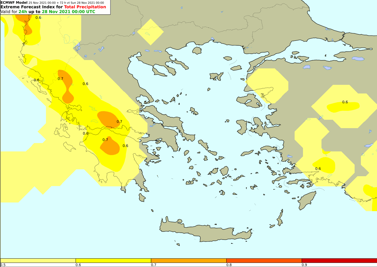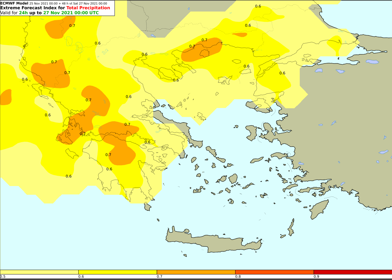 Σας ενημερώνουμε ότι σε σχετική ανάρτηση στο Twitter υπάρχει βίντεο με τα ύψη βροχής ανά 6ωρο. Παρακάτω ακολουθούν και δύο χάρτες με τον δείκτη EFI (Extreme Forecast Index) o οποίος μας δείχνει την επικινδυνότητα των βροχοπτώσεων σύμφωνα με τον χρωματικό κώδικα που χρησιμοποιούμε στο Meteoalarm