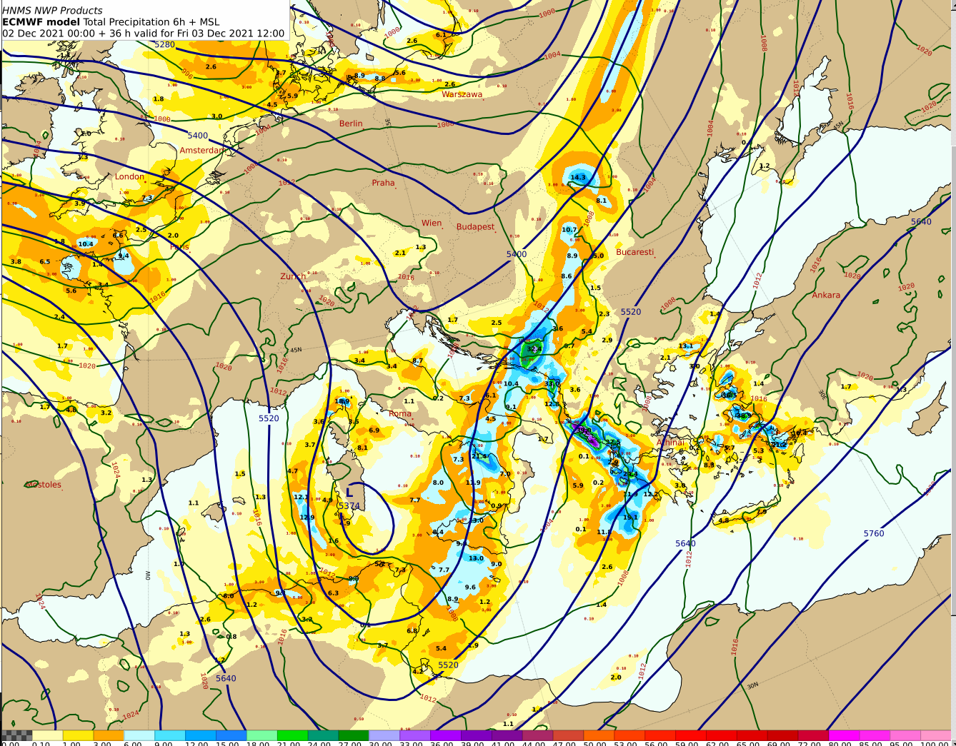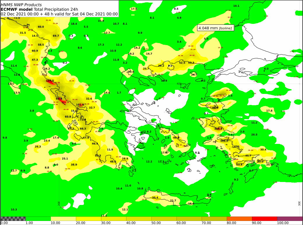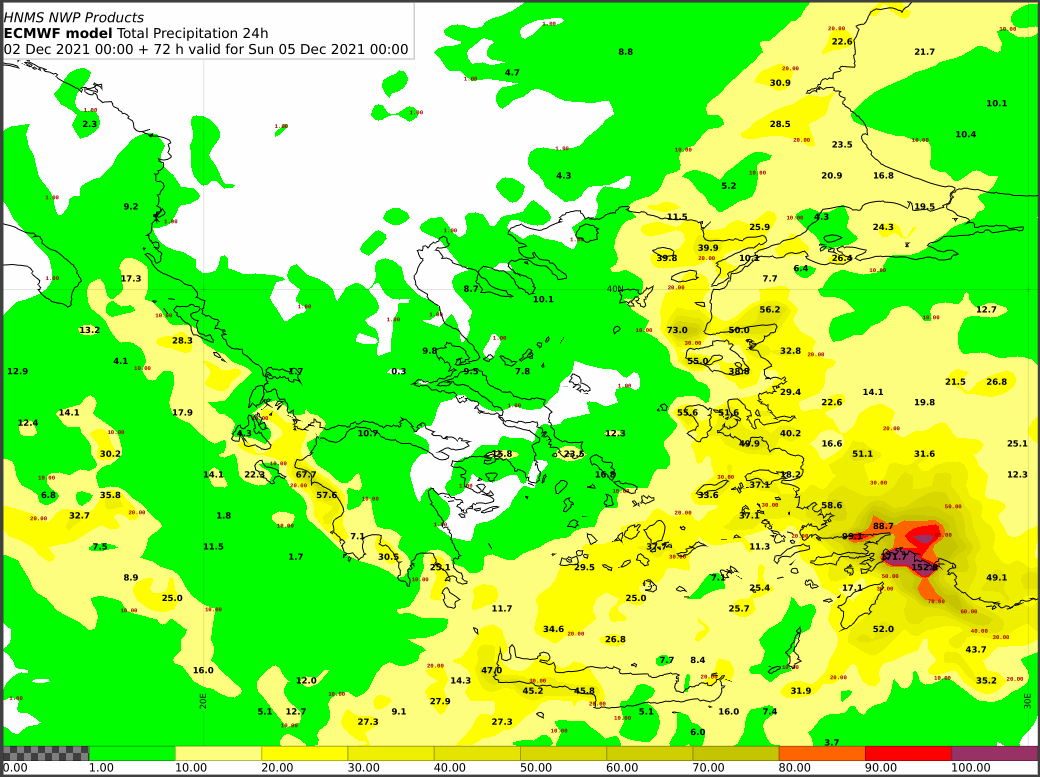 Στους 2 χάρτες που ακολουθούν παρουσιάζεται ο προβλεπόμενος 24ωρος υετός της Παρασκευής και του Σαββάτου. Ο υετός αναφέρεται στο 24ωρο που προηγήθηκε από τη ώρα ισχύος που αναφέρεται σε κάθε χάρτη