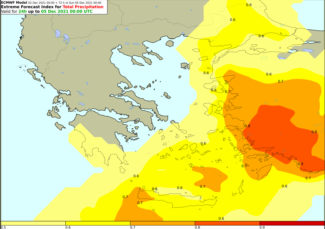Σας ενημερώνουμε ότι σε σχετική ανάρτηση στο Twitter υπάρχει βίντεο με τα ύψη βροχής ανά 6ωρο. Παρακάτω ακολουθούν και δύο χάρτες με τον δείκτη EFI (Extreme Forecast Index) o οποίος μας δείχνει την επικινδυνότητα των βροχοπτώσεων σύμφωνα με τον χρωματικό κώδικα που χρησιμοποιούμε στο Meteoalarm