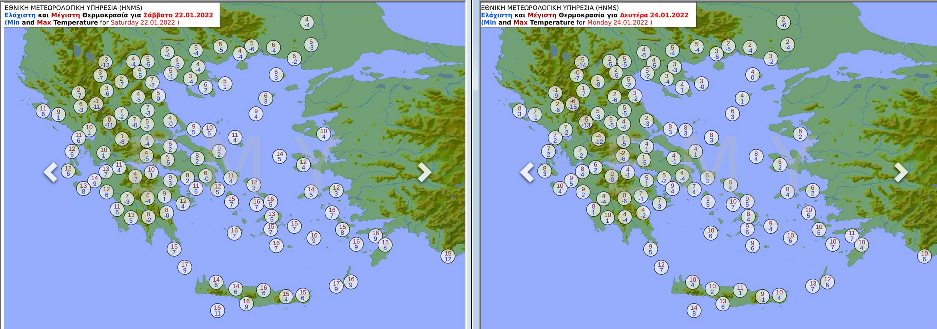 Ελάχιστες και μέγιστες θερμοκρασίες Σαββάτου-Δευτέρας 22 και 24/1/2022.