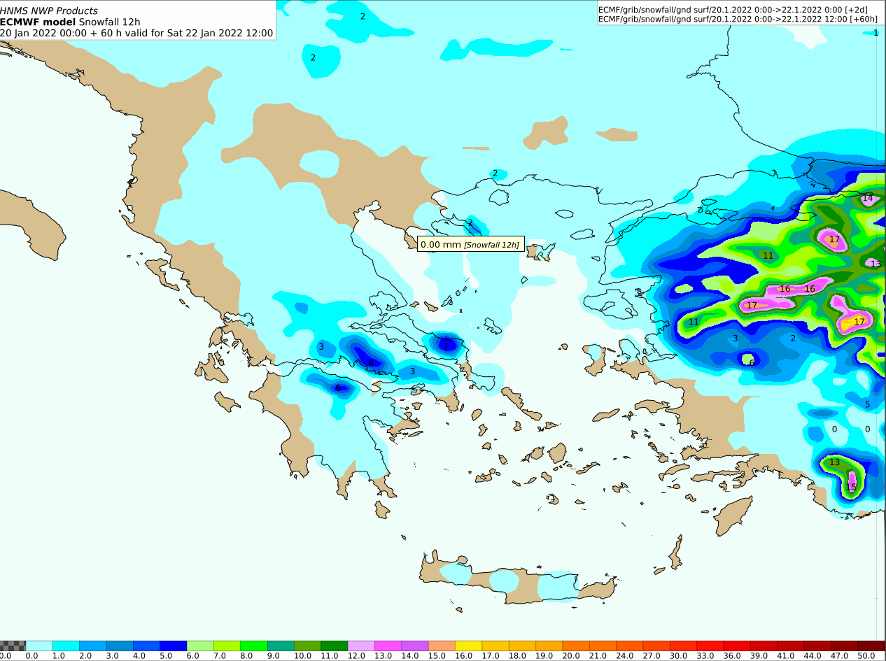Περιοχές χιονοπτώσεων Σάββατο 22-1-2022/12:00 UTC
