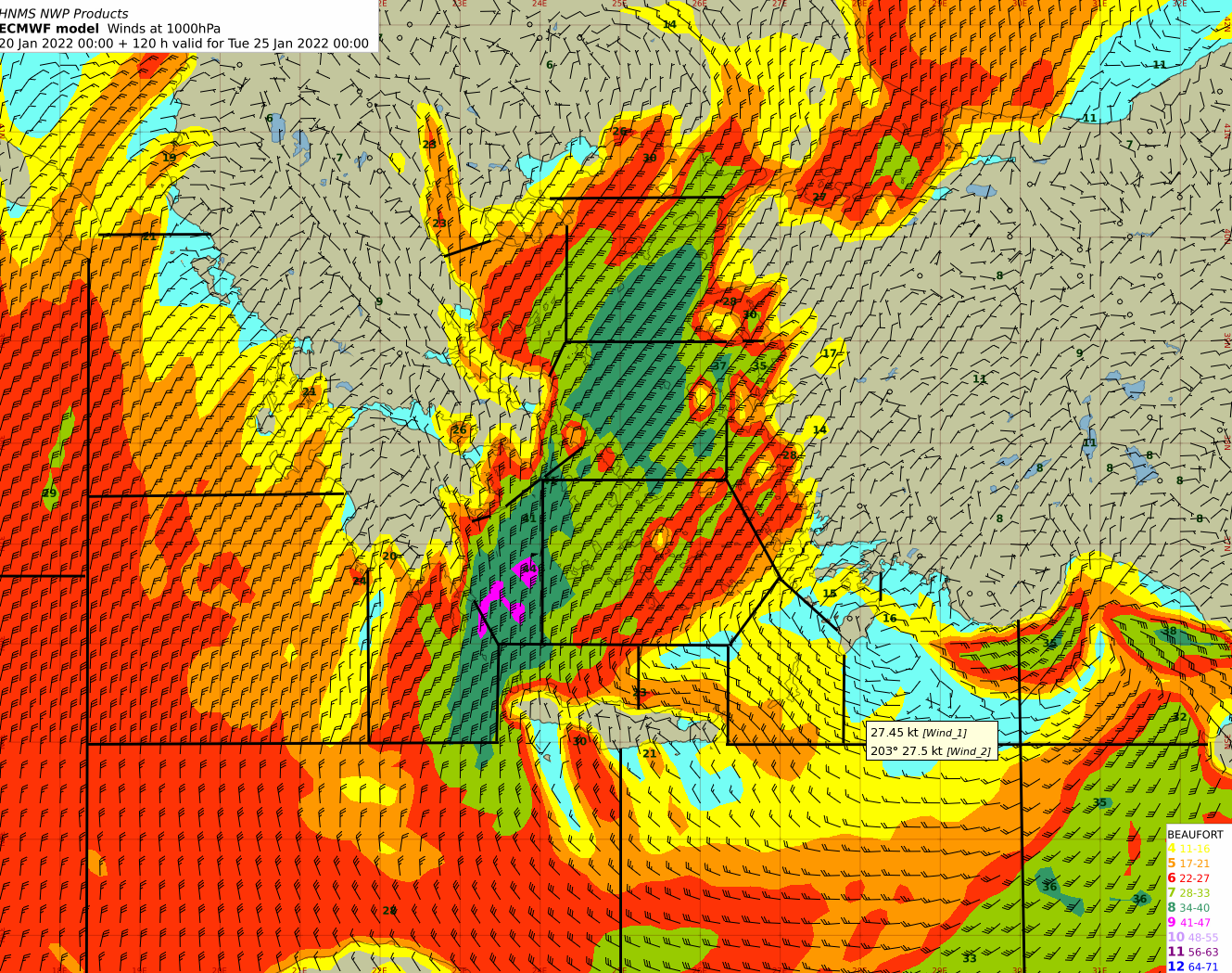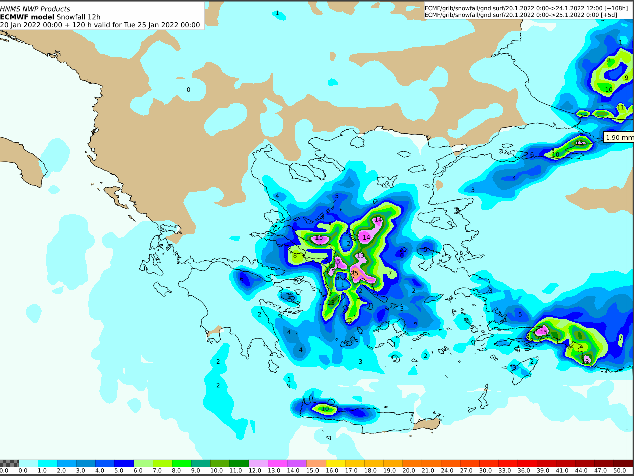 Περιοχές χιονοπτώσεων Τρίτη 25-1-2022/00:00 UTC