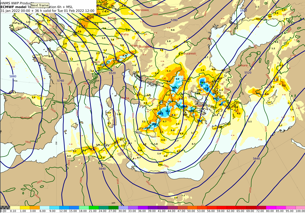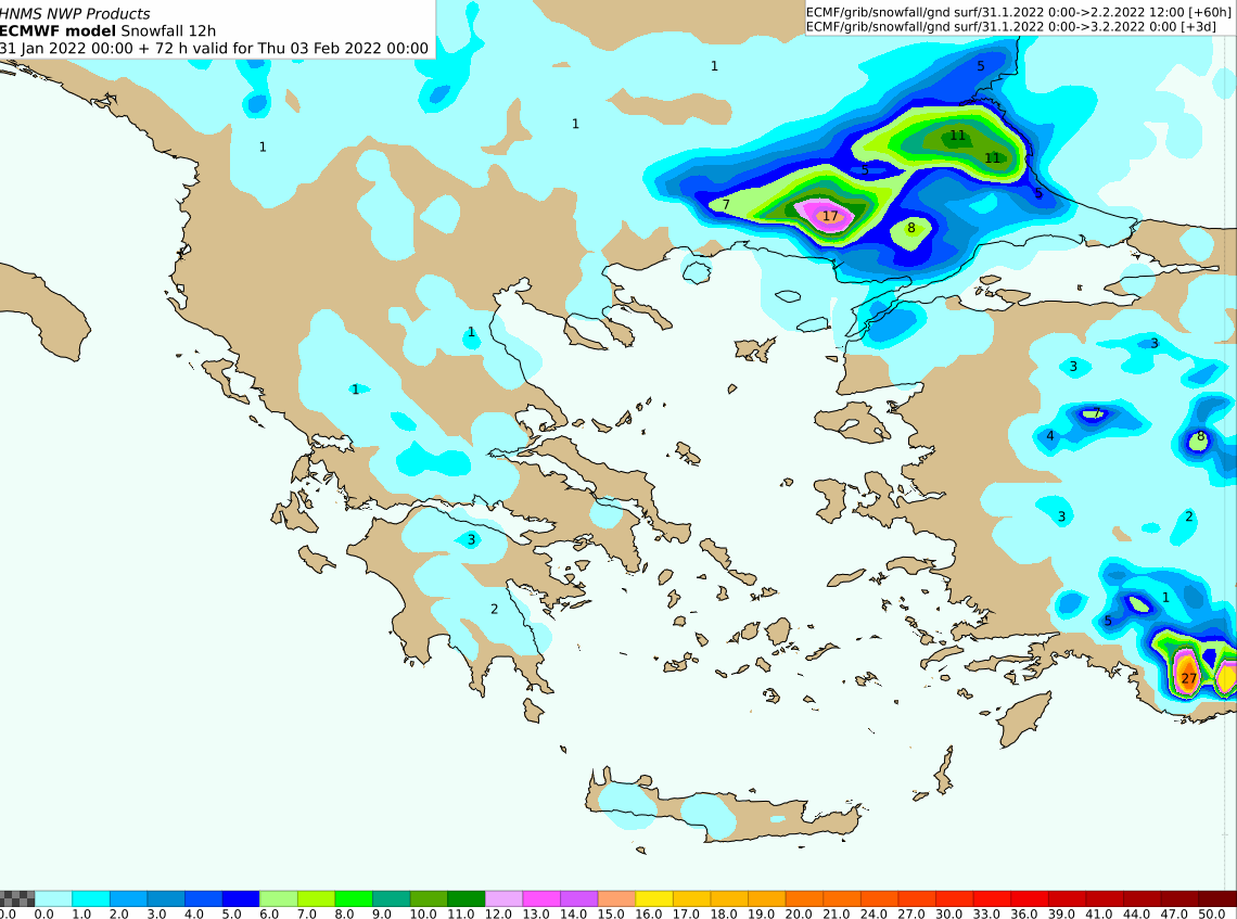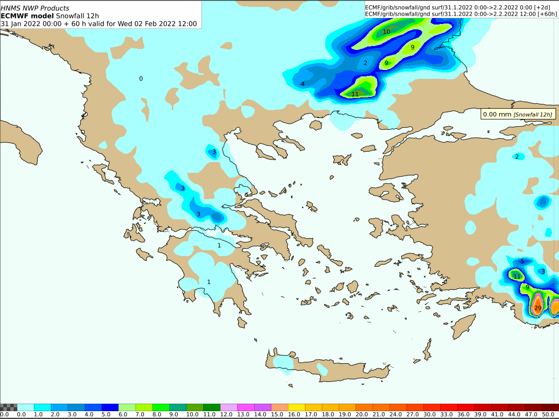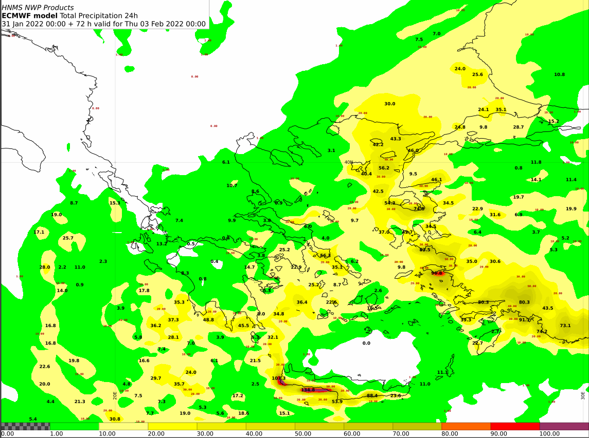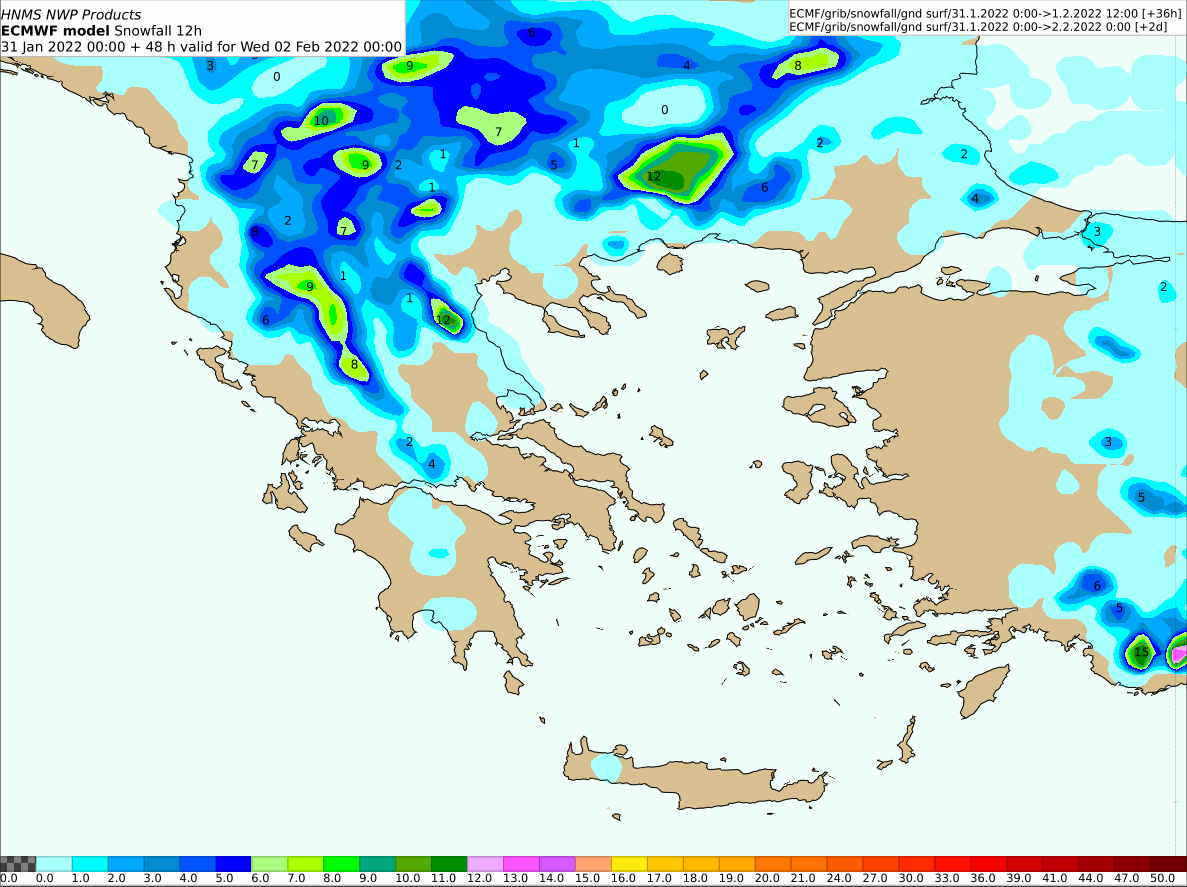 Την Τετάρτη θα συνεχιστούν οι κατά τόπους ισχυρές βροχές και καταιγίδες που θα επεκταθούν βαθμιαία από τις πρωινές ώρες στη Θεσσαλία, τις Σποράδες, την Εύβοια, την ανατολική Στερεά και πρόσκαιρα στην ανατολική Πελοπόννησο. Από το μεσημέρι προς το απόγευμα τα φαινόμενα θα επεκταθούν στις Κυκλάδες, την Κρήτη και τα Δωδεκάνησα. Οι χιονοπτώσεις θα είναι κατά τόπους πυκνές και θα σημειωθούν στα ορεινά της ηπειρωτικής χώρας, στα ημιορεινά της κεντρικής και βόρειας Ελλάδας,καθώς και σε περιοχές με χαμηλότερο υψόμετρο της Θράκης. Εξασθένηση των φαινομένων αναμένεται στο βόρειο Ιόνιο, την Ήπειρο και τη δυτική Στερεά το μεσημέρι και στη Θεσσαλία, τις Σποράδες και την Εύβοια το βράδυ. Αυτό διακρίνεται πολύ καλά στη συνολική χιονόπτωση 12ωρου από Τετάρτη μεσημέρι και μετά.