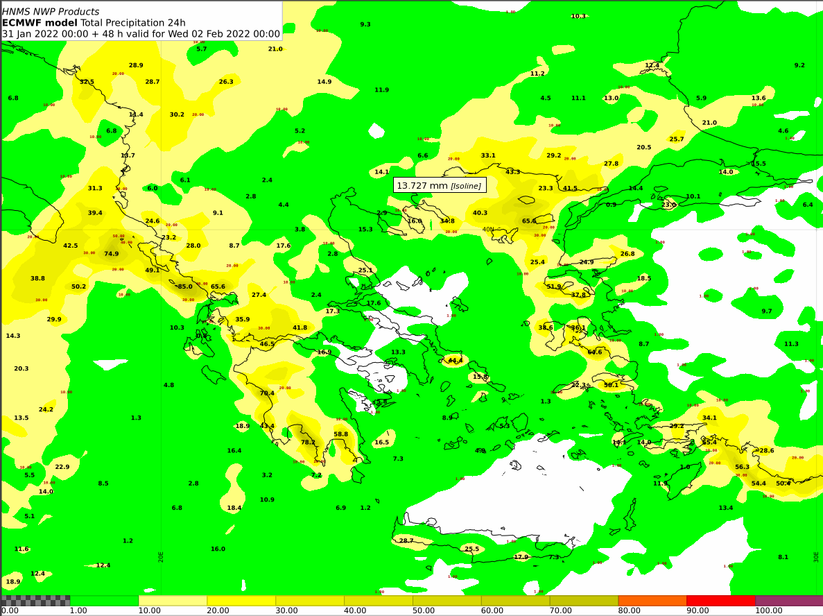 Την Τρίτη θα εκδηλωθούν βροχές και καταιγίδες από το μεσημέρι και μετά στα νησιά του Ιονίου, την Ήπειρο και τη δυτική Στερεά, από το απόγευμα στη δυτική Πελοπόννησο και από το βράδυ στην ανατολική Μακεδονία, τη Θράκη και τα νησιά του ανατολικού Αιγαίου. Χιονοπτώσεις θα σημειωθούν στη δυτική Μακεδονία και στα ορεινά-ημιορεινά της Ηπείρου και βαθμιαία της κεντρικής και ανατολικής Μακεδονίας και της Θράκης ενώ θυελλώδεις νότιοι νοτιοδυτικοί άνεμοι θα επικρατήσουν στα πελάγη, που η έντασή τους θα φτάνει τοπικά τα 8 και πιθανώς τα 9 μποφόρ. Παρακάτω ακολουθούν οι χάρτες 24ωρου υετού , καθώς και τα συνολικά ποσά χιονόπτωσης 12ωρου.