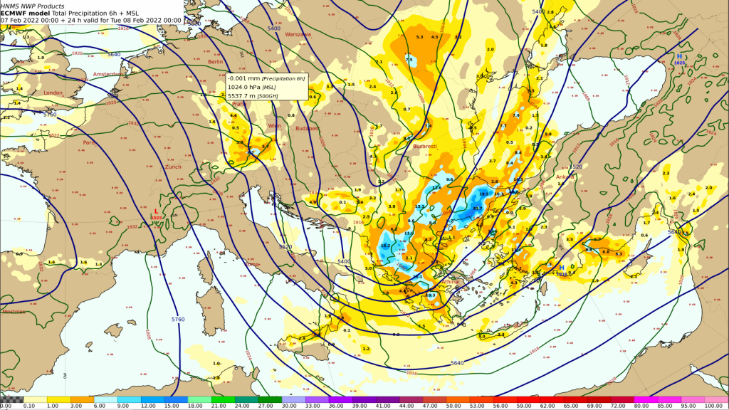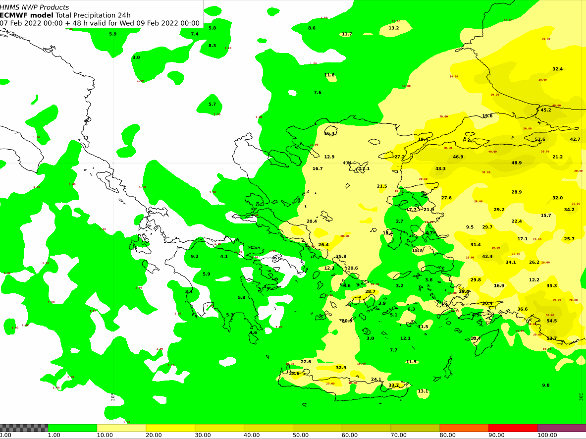 Διαταραχή στην ανώτερη ατμόσφαιρα που έρχεται από τα βορειοδυτικά Βαλκάνια θα προκαλέσει επιδείνωση του καιρού στη χώρα μας από το απόγευμα της Δευτέρας 07-02-2022 έως τις πρωινές ώρες της Τετάρτης 09-02-2022, με κύρια χαρακτηριστικά τους θυελλώδεις ανέμους εντάσεως 8 με 10 μποφόρ, τις κατά τόπους ισχυρές βροχές και καταιγίδες, τις πρόσκαιρα πυκνές χιονοπτώσεις σε κεντρικά και βόρεια και την αισθητή πτώση της θερμοκρασίας. Από τις βραδινές ώρες της Δευτέρας θυελλώδεις βόρειοι βορειοδυτικοί άνεμοι θα επικρατήσουν στα δυτικά από τις βραδινές ώρες, που η έντασή τους θα φτάνει τα 8 με 9 μποφόρ, ενώ Βροχές και καταιγίδες κατά τόπους ισχυρές θα εκδηλωθούν από το απόγευμα στο βόρειο Ιόνιο και την Ήπειρο, οι οποίες τη νύχτα θα επεκταθούν στη Μακεδονία, τη Θράκη, τη Θεσσαλία, τις Σποράδες, το νότιο Ιόνιο, τη Στερεά, την Πελοπόννησο και τα νησιά του βόρειου Αιγαίου. Χιονοπτώσεις κατά τόπους πυκνές θα σημειωθούν από το βράδυ της Δευτέρας στη δυτική Μακεδονία και στα ορεινά - ημιορεινά της Ηπείρου και βαθμιαία της κεντρικής και ανατολικής Μακεδονίας και της Θράκης.