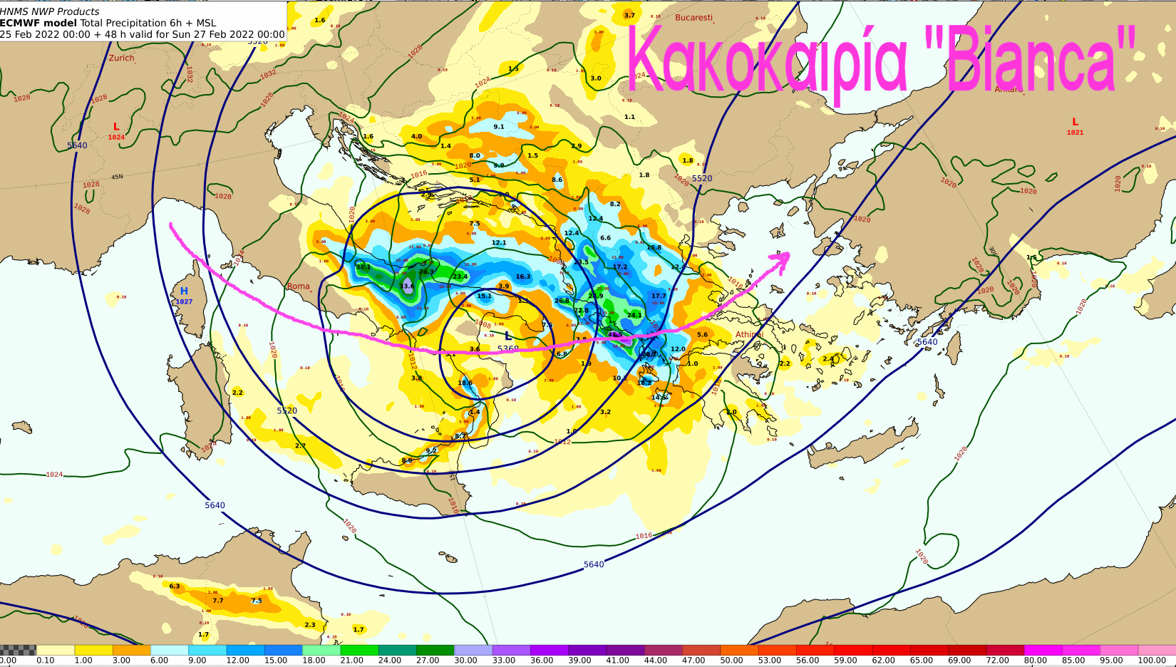 Καιρικό σύστημα με την ονομασία "Bianca", όπως ονομάστηκε από τη Μετεωρολογική Υπηρεσία της Ιταλίας, κινούμενο νοτιοανατολικά, προβλέπεται να προκαλέσει κακοκαιρία από τη νύχτα του Σαββάτου 26-02-2022) στη χώρα μας. Τα κύρια χαρακτηριστικά αυτής της κακοκαιρίας θα είναι οι κατά τόπους ισχυρές βροχές και καταιγίδες, οι πυκνές χιονοπτώσεις στην κεντρική και βόρεια χώρα, οι θυελλώδεις άνεμοι στα πελάγη και η πτώση της θερμοκρασίας.