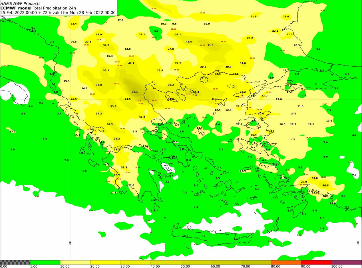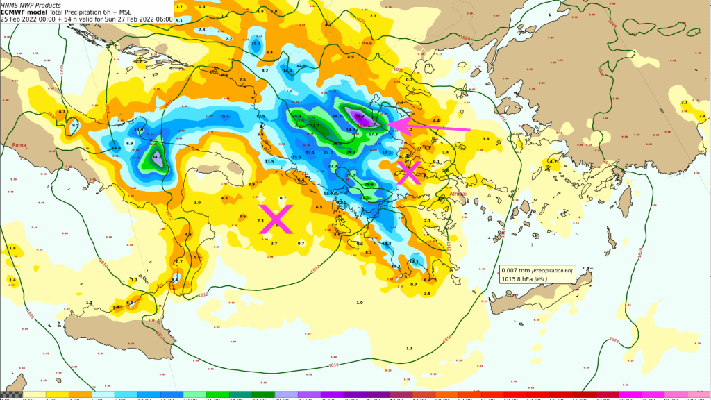 Παράλληλα επισυνάπτεται και ο συνολικός υετός του 24ωρου για όλη την Κυριακή , ενώ η εξήγηση γιατί εμφανίζονται μεγάλα τα ύψη υετού στη Θεσσαλία και τη Κεντρική και Δυτική Μακεδονία σας ενημερώνουμε ότι σε μεγάλο βαθμό αυτό οφείλεται στην επίδραση του Α-ΝΑ επιφανειακού ανέμου πάνω από τους ορεινούς όγκους των περιοχών ( οργραφικές βροχές)