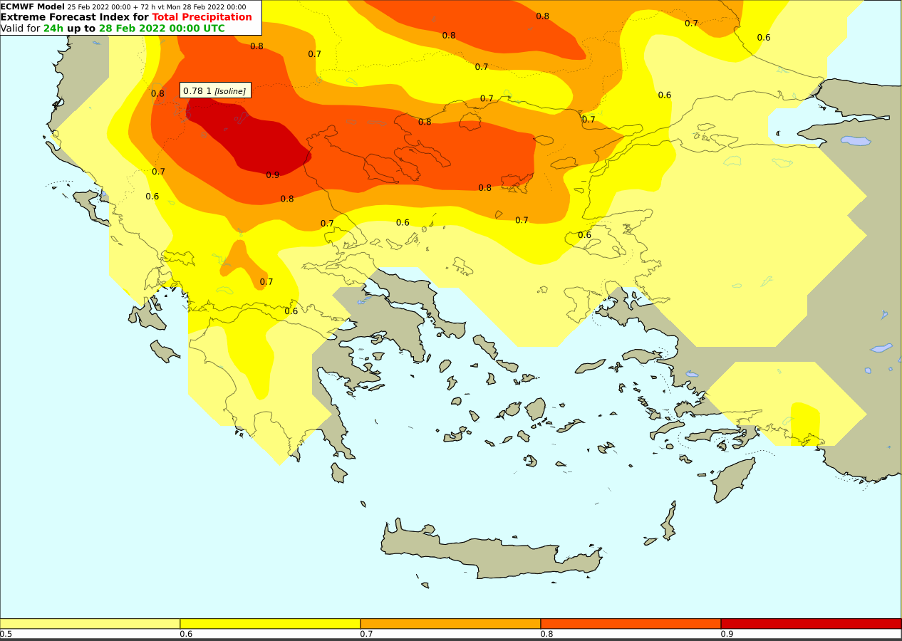 Την Κυριακή κατά τόπους ισχυρές βροχές και καταιγίδες θα εκδηλωθούν από τις πρώτες ώρες της Κυριακής στο βόρειο Ιόνιο, την Ήπειρο και τη δυτική Στερεά, και βαθμιαία στη Μακεδονία, τη Θεσσαλία, τις Σποράδες, τα νησιά του βορείου και ανατολικού Αιγαίου και τη Θράκη.Η επικινδυνότητα είναι πολύ μεγάλη κυρίως στη Θεσσαλία και τη Μακεδονία και αυτό καταγράφεται στον αντίστοιχο χάρτη EFI που ακολουθεί . Δείτε όμως και τον υετό για το επόμενο τριήμερο στο σχετικό σύνδεσμο