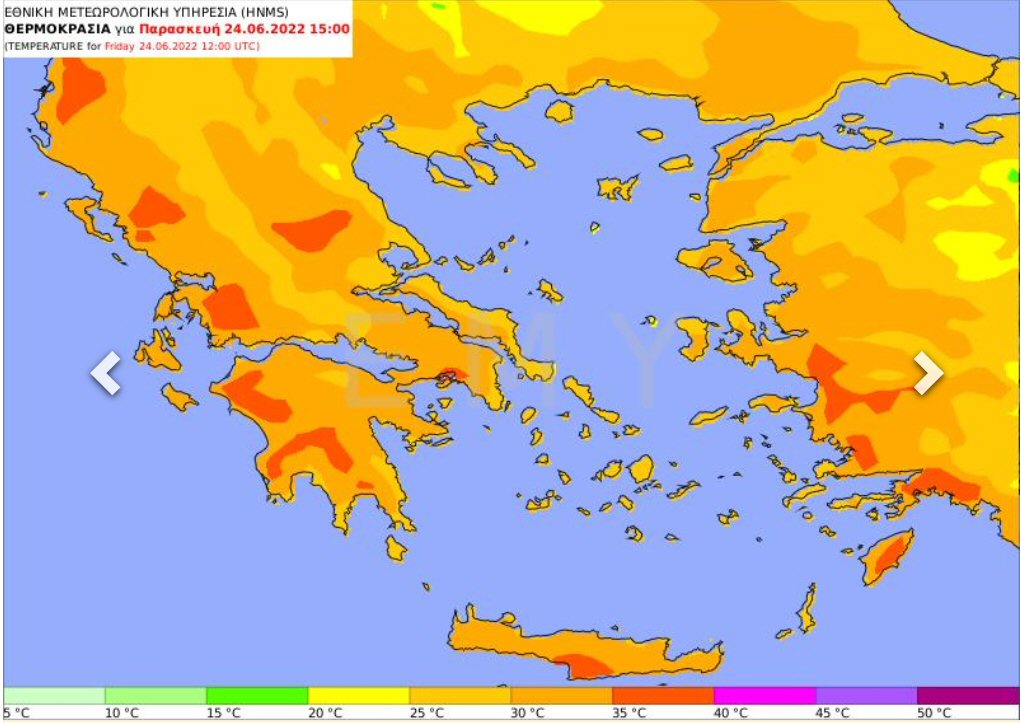 Στην παρούσα κατάσταση μετά την πολύ ζεστή μέρα την Πέμπτη θα έχουμε πρόσκαιρη υποχώρηση της ζέστης. Ωστόσο υπάρχουν ενδείξεις για συνέχιση της ζέστης μετά την Κυριακή και γιαυτό σας συστήνουμε να λαμβάνετε υπόψη σας τις οδηγίες της ΓΓΠΠ σχετικά με τις υψηλές θερμοκρασίες . Σε κάθε περίπτωση θα πρέπει να γνωρίζετε ότι η ΕΜΥ λαμβάνει υπόψη της όλα τα διαθέσιμα προγνωστικά στοιχεία και μετά από σχετική αξιολόγησή τους, εκδίδει τα ειδικά δελτία πρόγνωσης και προειδοποιήσεων, καθώς και τη σχετική ανάλυση της προβλεπόμενης εξέλιξης του καιρού.
