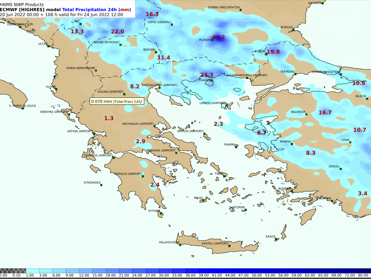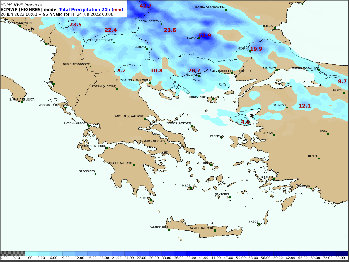 Επισημαίνεται ότι την Πέμπτη (23-06-2022) από τις απογευματινές ώρες στη Θράκη και τη Μακεδονία θα εκδηλωθούν κατά τόπους ισχυρές καταιγίδες που θα συνοδεύονται και από ισχυρούς ανέμους (μπουρίνια) που θα κρατήσουν και τις πρωινές ώρες της Παρασκευής