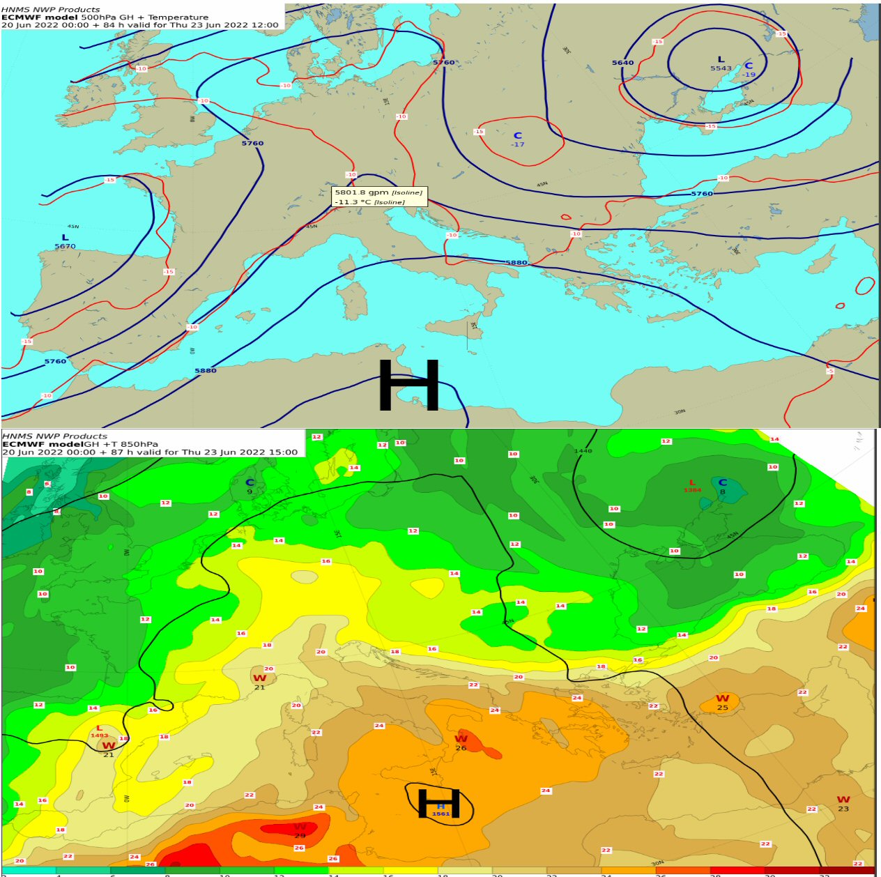 Οι υψηλές πιέσεις στη κεντρική Μεσόγειο στις ανώτερες στάθμες της ατμόσφαιρας δημιουργούν ευνοικές συνθήκες μεταφοράς θερμών αερίων μαζών από τις ακτές της Βόρειας Αφρικής προς την χώρα που θα έχει ως αποτέλεσμα την σταδιακή άνοδο της θερμοκρασίας και η μέγιστη τιμή της προβλέπεται να φθάσει κατά τόπους τους 40 με 41 βαθμούς Κελσίου, ενώ οι ελάχιστες θερμοκρασίες δεν θα είναι ιδιαίτερα υψηλές.. Λόγων των υψηλών θερμοκρασιών που θα επικρατήσουν εκδόθηκε το δελτίο επιδείνωσης του καιρού , ενώ παράλληλα θα πρέπει να επισημάνουμε ότι την Πέμπτη από τις απογευματινές ώρες στη Θράκη και τη Μακεδονία θα εκδηλωθούν κατά τόπους ισχυρές καταιγίδες που θα συνοδεύονται και από ισχυρούς ανέμους (μπουρίνια).