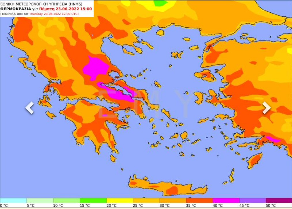 2. Την Πέμπτη (23-06-2022) τους 36 με 39 βαθμούς και τοπικά στη Θεσσαλία, την ανατολική Στερεά και την κεντρική Μακεδονία τους 40 με 41 βαθμούς Κελσίου.