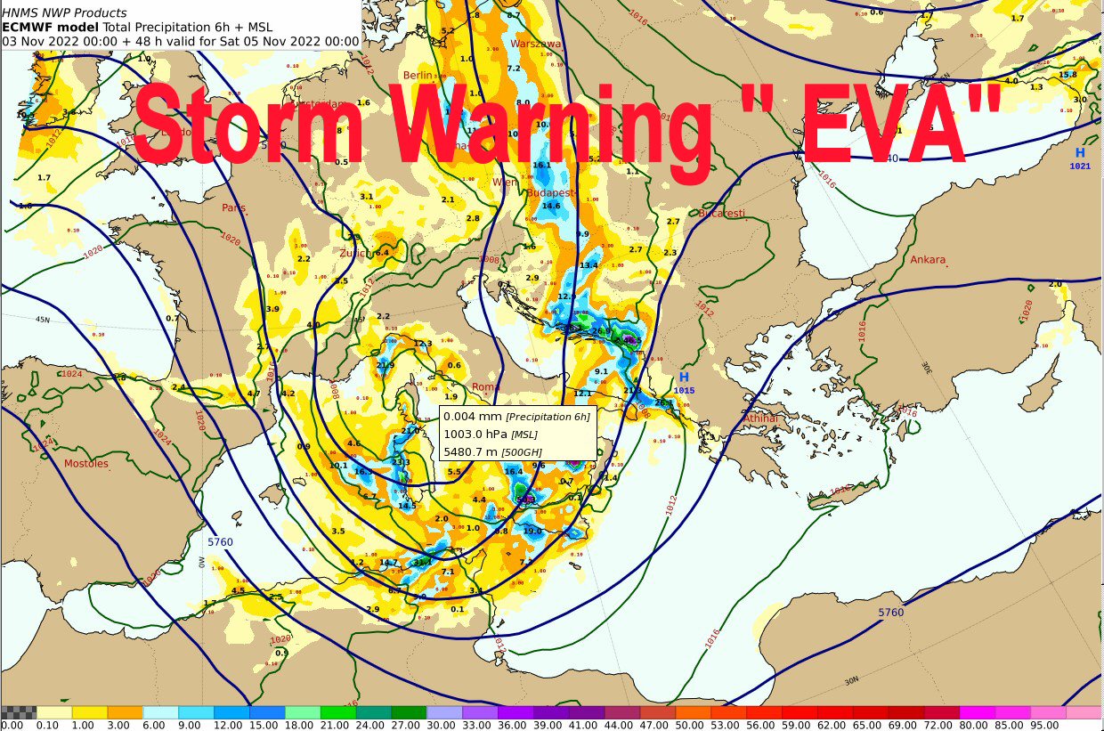 Καιρικό σύστημα με το όνομα "EVA" προβλέπεται να προκαλέσει κακοκαιρία το Σαββατοκύριακο στη χώρα μας. Το κύμα της κακοκαιρίας που ονομάστηκε από την ομάδα προειδοποιήσεων της Κεντρικής Μεσογείου (CENTRAL MED GROUP) θα προκαλέσει επικίνδυνα καιρικά φαινόμενα σε μεγάλο μέρος της χώρας μας, που θα έχουν ως κύρια χαρακτηριστικά τα μεγάλα ύψη βροχής , την έντονη ραγδαιότητα και τον μεγάλο αριθμό ηλεκτρικών εκκενώσεων.
