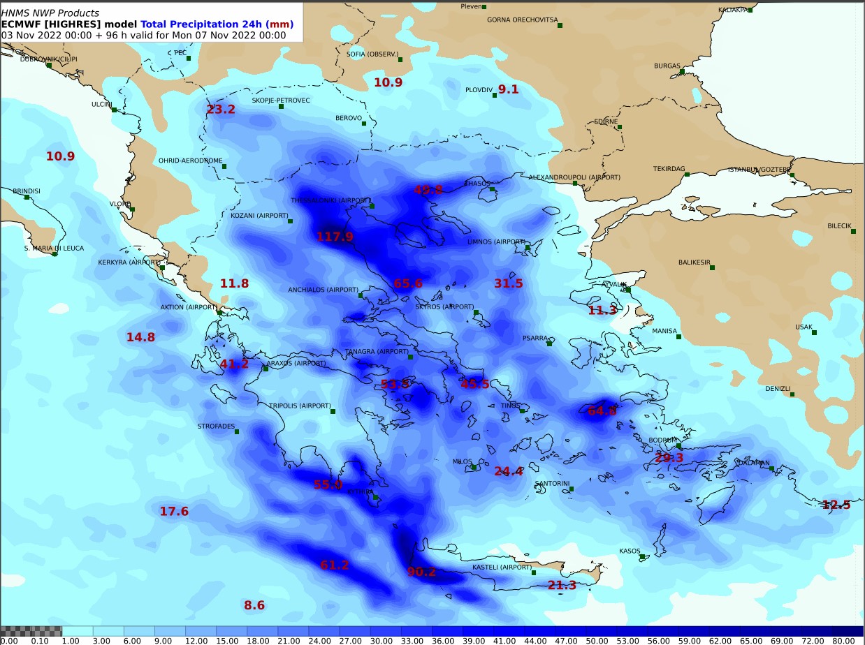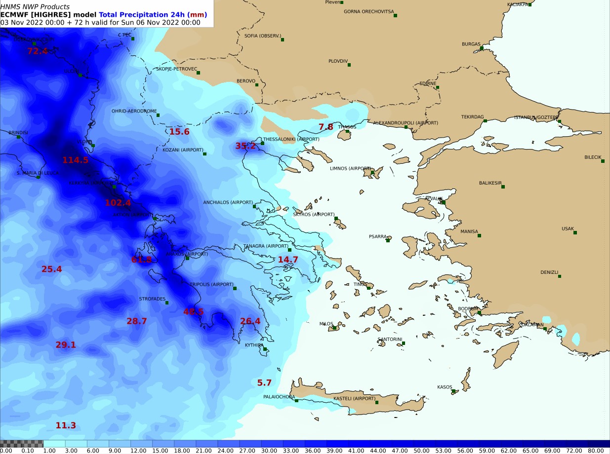 Την Κυριακή (06-11-2022) οι ισχυρές βροχές και οι καταιγίδες θα επηρεάσουν α) μέχρι το μεσημέρι το Ιόνιο, β) μέχρι το απόγευμα στην ηπειρωτική χώρα (πλην της Θράκης) γ) από τις πρωινές ώρες στις Κυκλάδες, την Κρήτη και τις Σποράδες