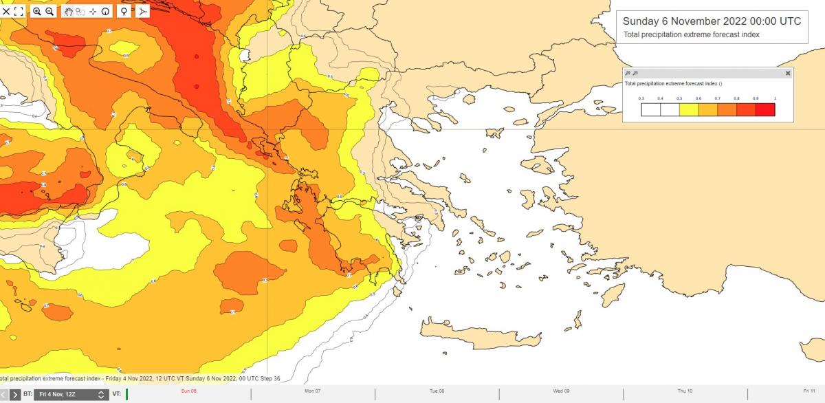 Στον νέο χάρτη του EFI διακρίνονται οι περιοχές των ακραίων τιμών υετού με βάση τις κλιματικές παραμέτρους κάθε περιοχής. Στα νοτιοδυτικά τμήματα της Κρήτης υπάρχουν ενδείξεις κοντά στο κόκκινο, στην Αττική καθώς επίσης στη δυτική και την κεντρική Μακεδονία και την ανατολική Θεσσαλία. Δεν πρέπει να ξεχνάμε όμως ότι ιδιαίτερη προσοχή χρειάζεται και στις υπόλοιπες περιοχές , οι οποίες αν και δεν θα δεχτούν τόσο μεγάλα ύψη βροχής , τα φαινόμενα θα έχουν μεγάλες ραγδαιότητες κυρίως μέχρι τις απογευματινές ώρες της Κυριακής. Επισημαίνονται ως περιοχές ιδιαίτερης προσοχής η Δυτική Κρήτη, η νότια Πελοπόννησος και τμήμα του Ανατολικού Αιγαίου Δωδεκανήσου.