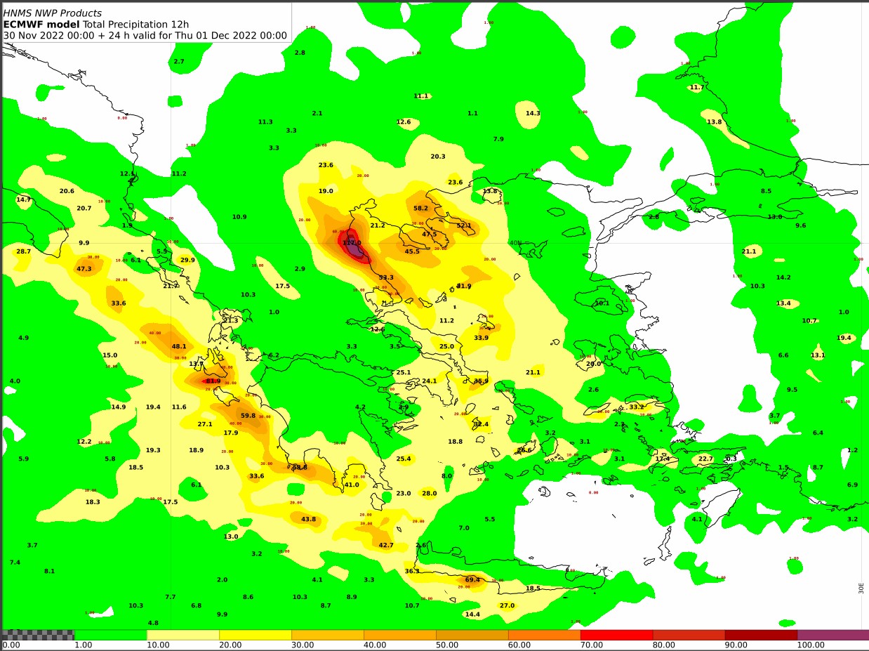 Σημειώνεται ότι τα φαινόμενα σήμερα Τετάρτη (30-11-2022) θα είναι κατά τόπους ιδιαίτερα ισχυρά στην κεντρική Μακεδονία (κυρίως νομούς Πιερίας και Χαλκιδικής) και στα βορειοανατολικά τμήματα της Θεσσαλίας μέχρι και τις μεσημβρινές ώρες της Πέμπτης (01-12-2022). Πάντως όπως αναφέραμε και παραπάνω, ισχυρές βροχές και καταιγίδες θα εκδηλώνονται στο Ιόνιο (κυρίως Ζάκυνθο Κεφαλλονιά) , την Πελοπόννησο, τη δυτική και την ανατολική Στερεά (συμπεριλαμβανομένης της Αττικής), την Εύβοια και τη δυτική και τη νότια Κρήτη μέχρι τις προμεσημβρινές ώρες της Πέμπτης.