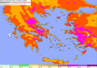 2. Την Πέμπτη (13-7-2023) υψηλές θερμοκρασίες θα επικρατήσουν σε όλη σχεδόν τη χώρα. α. Στα βόρεια ηπειρωτικά η μέγιστη τιμή της θερμοκρασίας θα φθάσει τους 37 με 38 βαθμούς και στην κεντρική Μακεδονία και το εσωτερικό της Ηπείρου τους 39 με 40 βαθμούς Κελσίου ενώ οι ελάχιστες τιμές της θα κυμανθούν περί τους 28 με 30 βαθμούς Κελσίου .β. Στα υπόλοιπα ηπειρωτικά η μέγιστη τιμή της θερμοκρασίας θα φθάσει τους 39 με 40 και στο εσωτερικό της Στερεάς και της Θεσσαλίας τους 41 βαθμούς Κελσίου ενώ οι ελάχιστες τιμές της θα κυμανθούν περί τους 27 με 29 βαθμούς Κελσίου. γ. Στη νησιωτική χώρα η μέγιστη τιμή της θερμοκρασίας θα φθάσει τους 33 με 35 και στα νησιά του Ιονίου, τα νησιά του ανατολικού Αιγαίου, τα Δωδεκάνησα και τη νότια Κρήτη τους 36 με 37 βαθμούς Κελσίου ενώ οι ελάχιστες τιμές της θα κυμανθούν περί τους 25 με 27 βαθμούς Κελσίου.