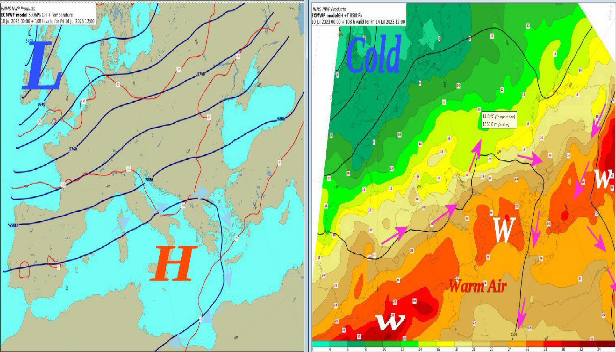 Το εκτεταμένο πεδίο υψηλών πιέσεων που καλύπτει τις ακτές της Αφρικής και τη Δυτική και Κεντρική Μεσόγειο και συνοδεύεται από πολύ θερμές αέριες μάζες επεκτείνεται σταδιακά ανατολικότερα και προκαλεί συνθήκες Καύσωνα από την Τετάρτη (12-7-2023) έως και τις αρχές της επόμενης εβδομάδας. Ο καύσωνας αυτός λαμβάνει την ονομασία CLEON και εντάσσεται στα Επικίνδυνα Καιρικά Φαινόμενα και η ΕΜΥ έχει εκδώσει Έκτακτο Δελτίο με διάρκεια τουλάχιστον έξι ημερών, με θερμότερες ημέρες να είναι η Παρασκευή (14-7-2023) και το Σάββατο (15-7-2023).