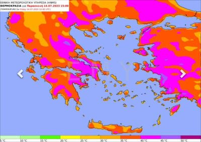 3. Την Παρασκευή (14-7-2023) οι υψηλές θερμοκρασίες θα κορυφωθούν . α. Στα βόρεια ηπειρωτικά η μέγιστη τιμή της θερμοκρασίας θα φθάσει τους 38 με 39 βαθμούς και στην κεντρική Μακεδονία και το εσωτερικό της Ηπείρου τους 40 με 41 βαθμούς Κελσίου ενώ οι ελάχιστες τιμές της θα κυμανθούν περί τους 30 με 32 βαθμούς. β. Στα υπόλοιπα ηπειρωτικά η μέγιστη τιμή της θερμοκρασίας θα φθάσει τους 40 με 41, στο εσωτερικό της Στερεάς τους 41 με 42 και στο εσωτερικό της Θεσσαλίας τους 43 βαθμούς Κελσίου ενώ οι ελάχιστες τιμές της θα κυμανθούν περί τους 28 με 30 βαθμούς. γ. Στη νησιωτική χώρα η μέγιστη τιμή της θερμοκρασίας θα φθάσει τους 35 με 36 και στα νησιά του Ιονίου, τα νησιά του ανατολικού Αιγαίου, τα Δωδεκάνησα και τη νότια Κρήτη τους 37 με 39 βαθμούς Κελσίου ενώ οι ελάχιστες τιμές της θα κυμανθούν περί τους 27 με 29 βαθμούς. Τα μεγάλα αστικά κέντρα και ιδιαίτερα η Αττική περιλαμβάνονται μέσα στις περιοχές με μωβ χρωματισμό και με τιμές πάνω από τους 40 βαθμούς Κελσίου.
