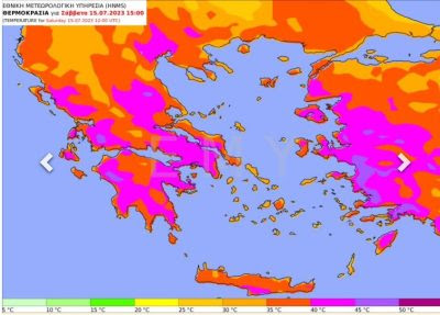 4. Το Σάββατο (15-7-2023) οι πολύ υψηλές θερμοκρασίες θα διατηρηθούν. α. Στα βόρεια ηπειρωτικά η μέγιστη τιμή της θερμοκρασίας θα φθάσει τους 38 με 39 βαθμούς και στην κεντρική Μακεδονία και το εσωτερικό της Ηπείρου τους 40 με 41 βαθμούς Κελσίου ενώ οι ελάχιστες τιμές θα κυμανθούν περί τους 30 με 32 βαθμούς. β. Στα υπόλοιπα ηπειρωτικά τους 40 με 41, στο εσωτερικό της Στερεάς και της Πελοποννήσου τους 41 με 42 και στο εσωτερικό της Θεσσαλίας τους 43 βαθμούς Κελσίου ενώ οι ελάχιστες τιμές θα κυμανθούν περί τους 29 με 31 βαθμούς. γ. Στη νησιωτική χώρα τους 36 με 37 και στα νησιά του Ιονίου, τα νησιά του ανατολικού Αιγαίου, τα Δωδεκάνησα και τη νότια Κρήτη τους 38 με 39 βαθμούς Κελσίου ενώ οι ελάχιστες τιμές θα κυμανθούν περί τους 28 με 30 βαθμούς Κελσίου.