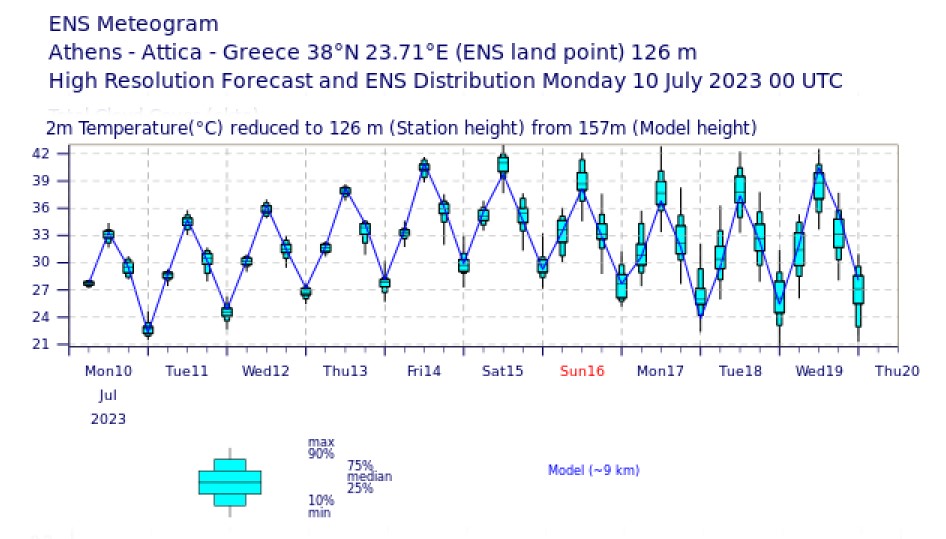Στο παραπάνω μετεώγραμμα, το οποίο αποτελεί ένα βασικό εργαλείο για τις προγνώσεις διακρίνουμε μέσες θερμοκρασίες στους 40 με 41 βαθμούς Κελσίου για την Αθήνα από τα πιθανολογικά "κουτιά", τα οποία αγγίζουν και λίγο υψηλότερες τιμές. Από την Κυριακή και μετά, τα διαστήματα (εύρη θερμοκρασιών) γίνονται μεγαλύτερα και για τον λόγο αυτό περιοριζόμαστε στις προγνώσεις μας με τιμές έως το ερχόμενο Σάββατο.