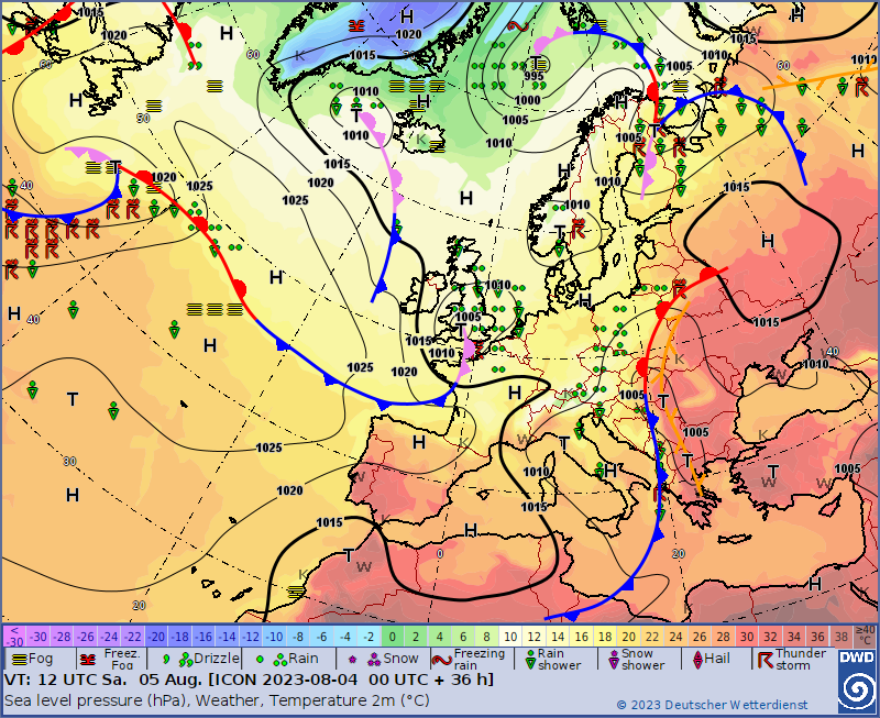 Στον σχετικό χάρτη επιφανείας που ισχύει για το Σάββατο 00:00UTC διακρίνουμε το ψυχρό μέτωπο το οποίο ξεκινά από τα ΒΔ Βαλκάνια και εκτείνεται μέχρι και τις ακτές της Λιβύης.