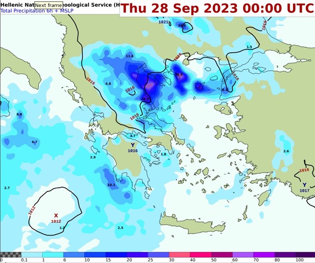 Την Τετάρτη (27-09-2023) σε όλη σχεδόν τη χώρα προβλέπονται βροχές ενώ καταιγίδες τοπικά ισχυρές θα εκδηλωθούν στο Ιόνιο, την ηπειρωτική χώρα και το βόρειο Αιγαίο.