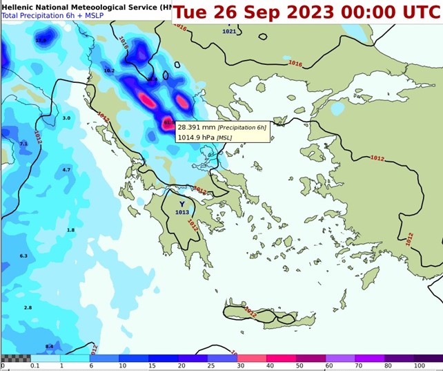 Την Τρίτη (26-09-2023) στο Ιόνιο και τα ηπειρωτικά (πλην της ανατολικής Μακεδονίας και Θράκης) προβλέπονται νεφώσεις με τοπικές βροχές και τοπικά ισχυρές καταιγίδες.