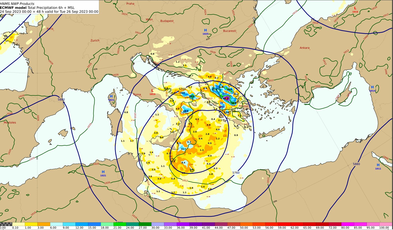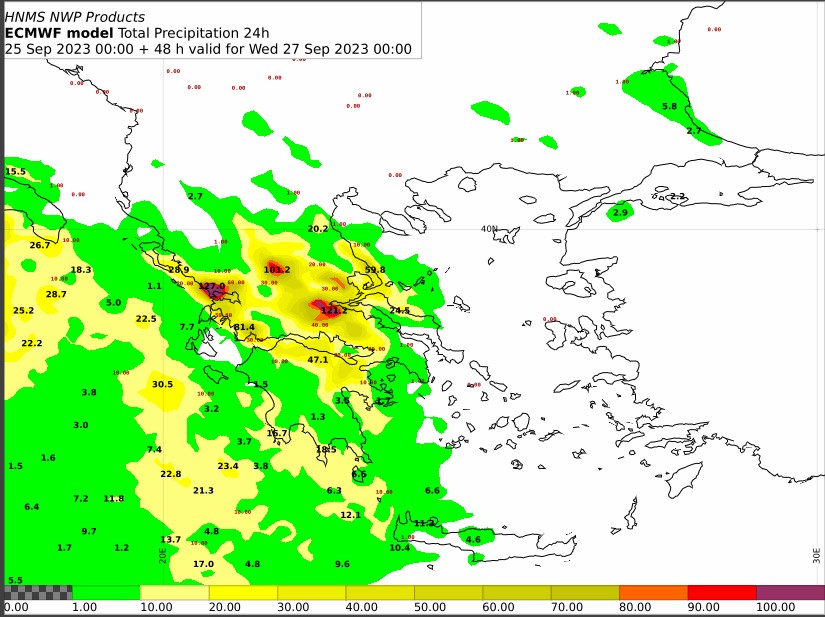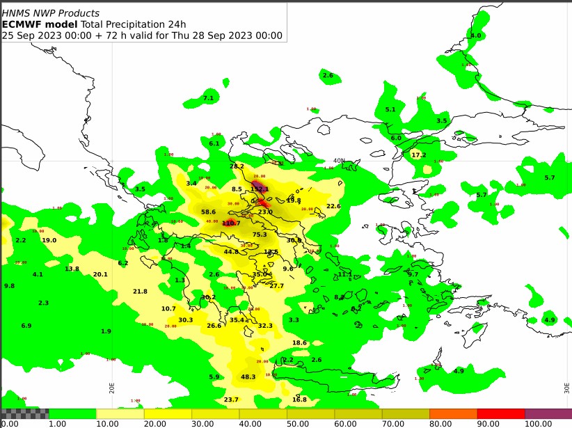 Τη Δευτέρα (25-09-2023)κατά τόπους ισχυρές βροχές και καταιγίδες θα εκδηλωθούν κυρίως στη Θεσσαλία, καθώς και στη δυτική Μακεδονία, τα δυτικά τμήματα της κεντρικής Μακεδονίας και τους νομούς Φωκίδας, Φθιώτιδας, Ευρυτανίας και Βοιωτίας της Στερεάς. Πρόσκαιρα είναι πιθανό να επηρεαστούν η Ήπειρος, η δυτική Στερεά και η βόρεια Πελοπόννησος.