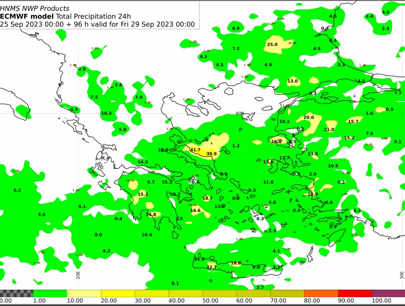 Χάρτης 4 : Ύψη 24ωρου υετού από Τετάρτη 00 έως Πέμπτη 00 UTC Πηγή :EMY/ECMWF