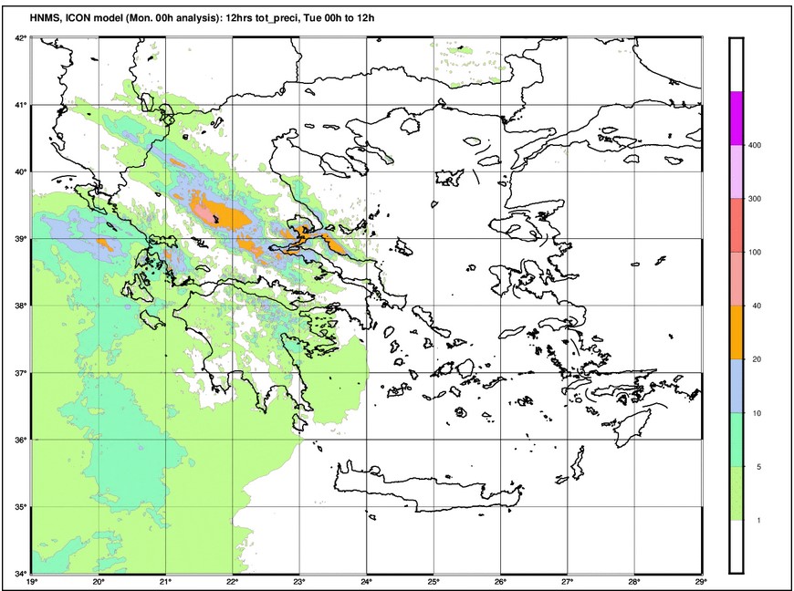 Χάρτης 1 : Ύψη 12ωρου υετού από Δευτέρα 12 έως Τρίτη 00 UTC . Πηγή :EMY/ECMWF