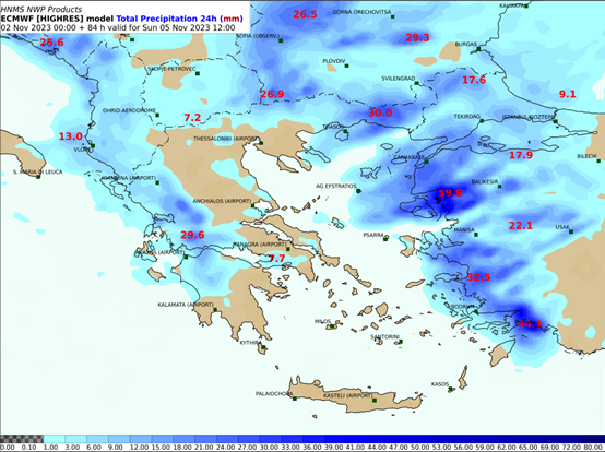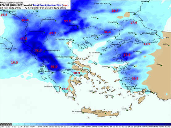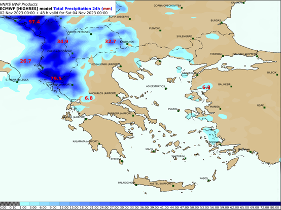 Ο δείκτης EFI (extreme Forecast Index) για τις βροχοπτώσεις λαμβάνει υψηλές τιμές στα δυτικά και περισσότερο στην Αιτωλοακαρνανία Αχαία και Ηλεία , καθώς επίσης στην Ήπειρο και στην περιοχή της Ανατολικής Μακεδονίας -Θράκης .
