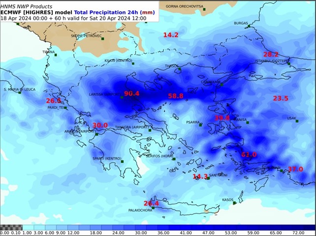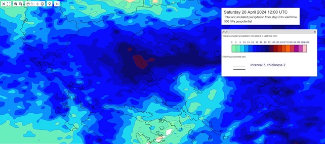 Χάρτης: O αθροιστικός υετός 24ωρου έως το μεσημέρι του Σαββάτου- Περιοχές με τα μεγαλύτερα ύψη βροχής
