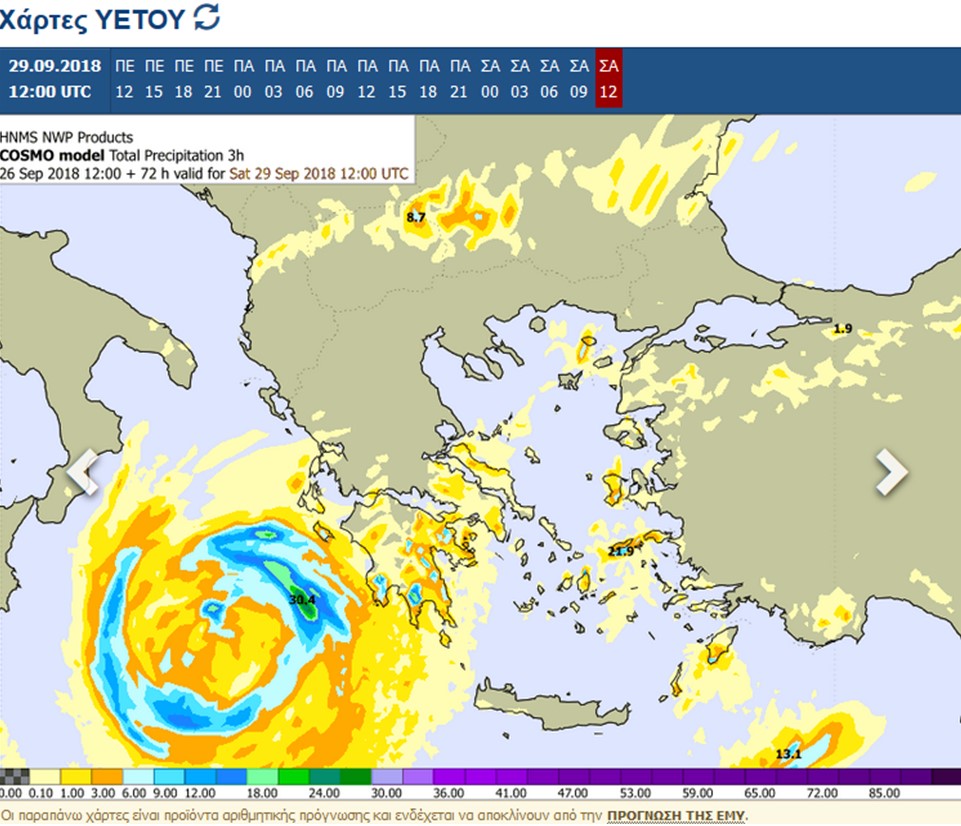 Από την ιστοσελίδα της ΕΜΥ μπορείτε να δείτε τα προγνωστικά δεδομένα του υετού με μεγαλύτερη λεπτομέρεια ανά 3ωρο όπως αυτά παράγονται από το προγνωστικό μοντέλο Cosmo που χρησιμοποιεί η ΕΜΥ επιχειρησιακά. Σε κάθε περίπτωση θα πρέπει να γνωρίζετε ότι η ΕΜΥ λαμβάνει υπόψη της όλα τα διαθέσιμα προγνωστικά στοιχεία και μετά από σχετική αξιολόγησή τους εκδίδει τα ειδικά δελτία πρόγνωσης και προειδοποιήσεων.